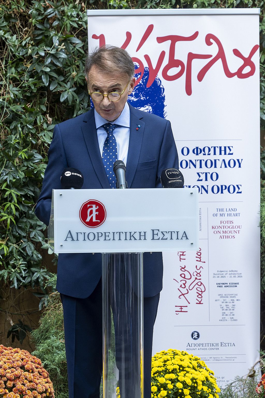 Ο Δήμαρχος Θεσσαλονίκης και Πρόεδρος του Δ.Σ. της Αγιορειτικής Εστίας κ. Στέλιος Αγγελούδης καλωσόρισε τον Πρόεδρο της Δημοκρατίας στην έκθεση και μίλησε για την πορεία του Κόντογλου στο Άγιον Όρος, την σχέση που ανέπτυξε με τους μοναχούς και ολοκληρώνοντας αναφέρθηκε στους στόχους της έκθεσης: «Η έκθεση της Αγιορειτικής Εστίας στοχεύει στην ανάδειξη της ιδιαίτερης σχέσης του μεγάλου δημιουργού με την Αθωνική Πολιτεία, η οποία διήρκησε καθ’ όλη τη διάρκεια του βίου του και τον ανατροφοδοτούσε σε πνευματικό και καλλιτεχνικό επίπεδο».https://www.agioritikiestia.gr/el/egkainia-ekthesis-i-xora-tis-kardias-mou-o-fotis-kontoglou-sto-agion-oros#sigProId123f8b5b63