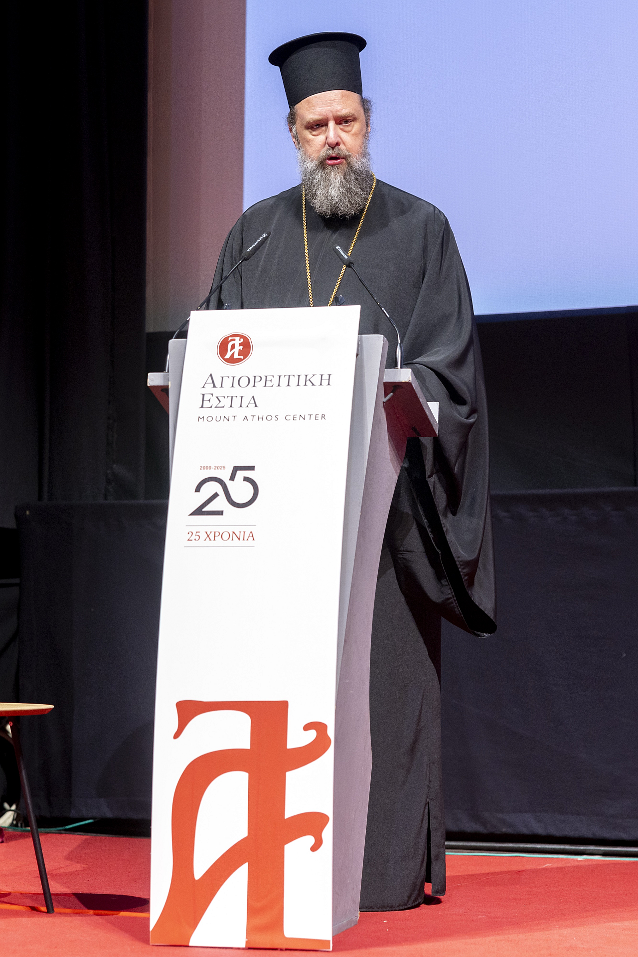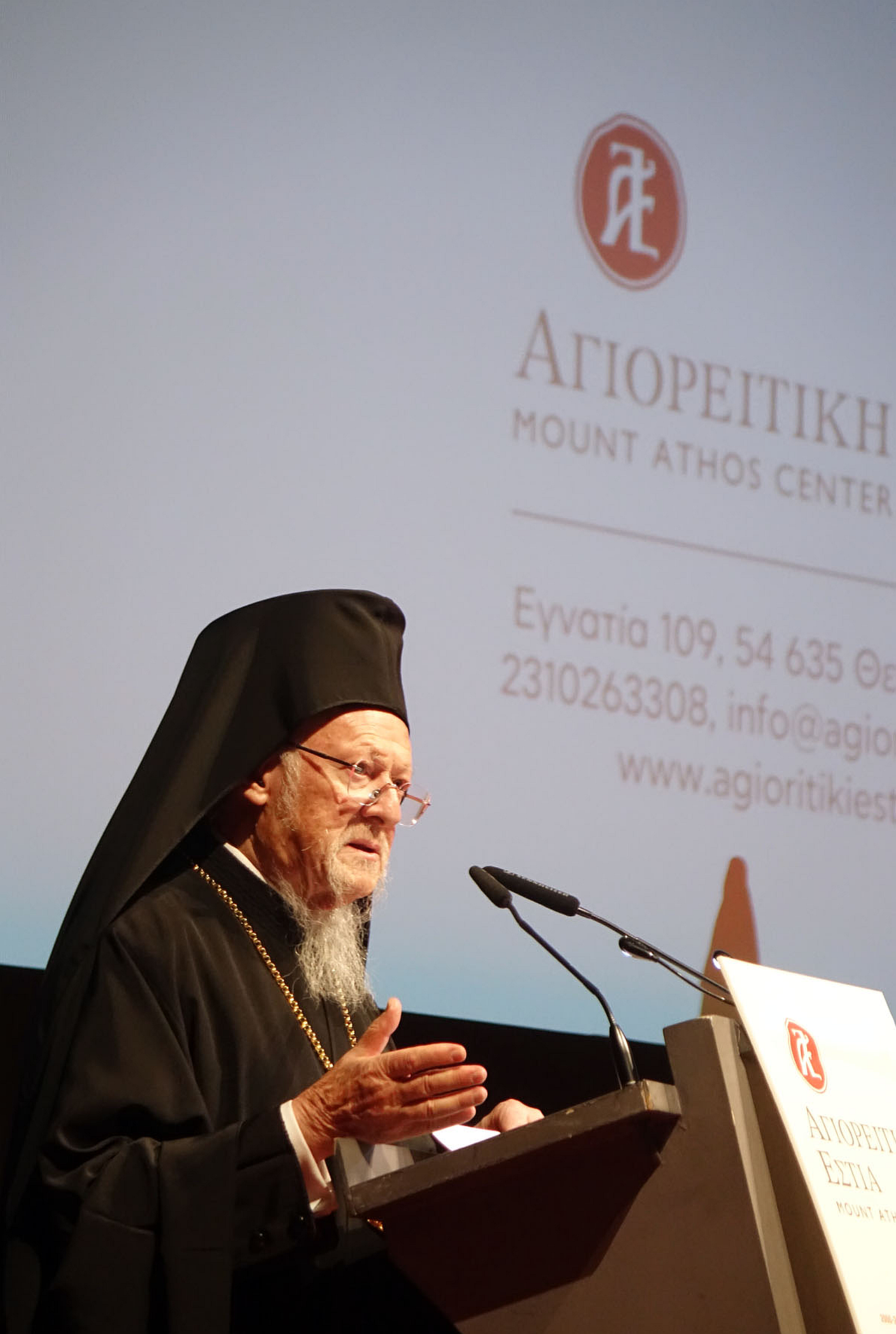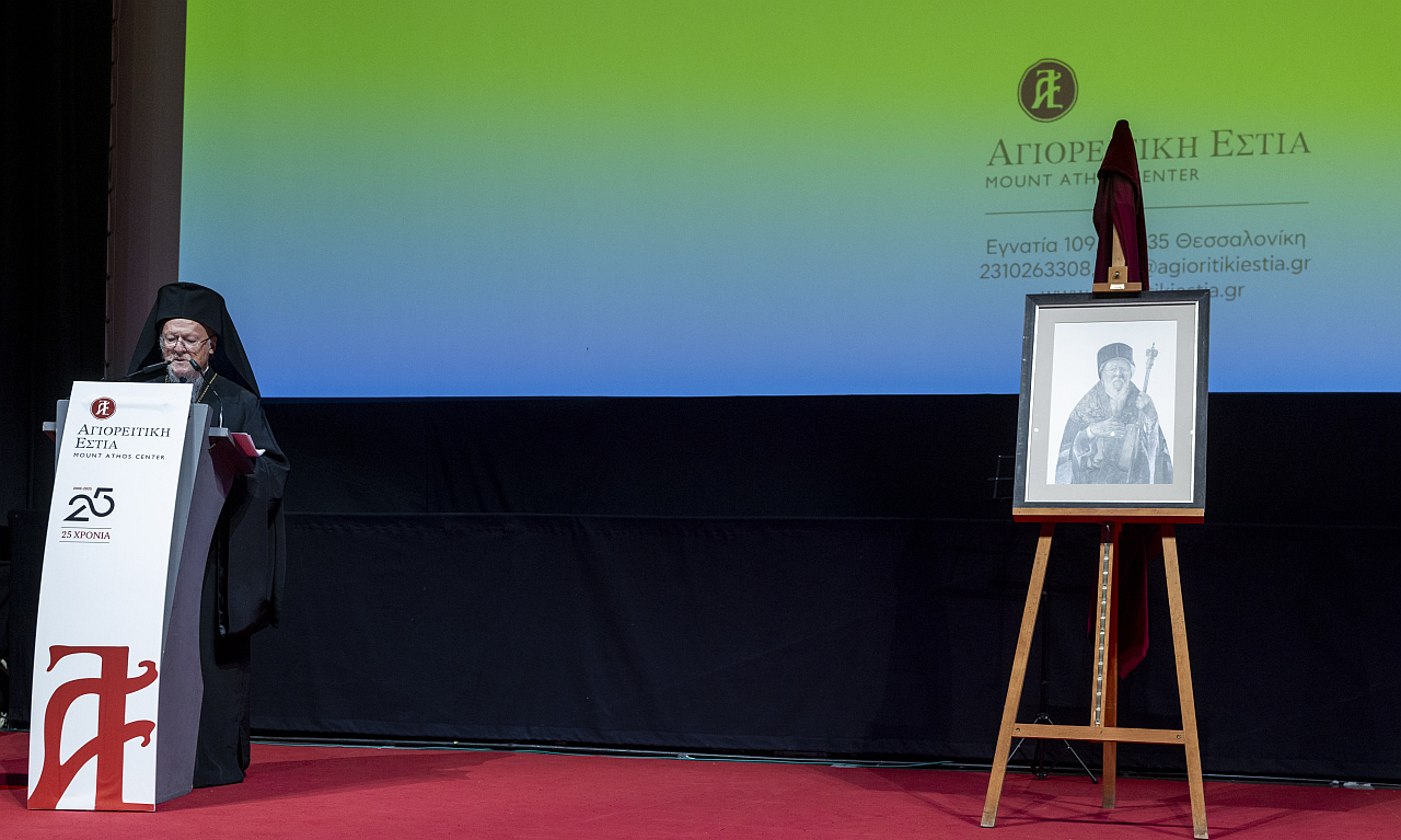 Ακολούθησε ο λόγος του που εστίασε στον μοναχισμό και στον πολιτισμό μέσα από την μαρτυρία του Αγίου Όρους, και η ομιλία του Οικουμενικού Πατριάρχου ολοκληρώθηκε με συγχαρητήριες ευχές «Ἐπί τῇ συμπληρώσει τῶν εἰκοσιπέντε ἐτῶν λειτουργίας τῆς Ἁγιορειτικῆς Ἐστίας, ἐπαναβεβαιοῦμεν τήν Πατριαρχικήν εὐαρέσκειαν καί πατρικήν ἡμῶν στοργήν πρός πάντας τούς συντελεστάς διά τόν ἀκάματον μόχθον πού κατέβαλον καὶ καταβάλλουν. Ἡ Μετριότης ἡμῶν, θεωροῦσα τούς πλουσίους καρπούς τῆς Ἱερᾶς ταύτης ἀποστολῆς, χαίρει καί συγχαίρει».