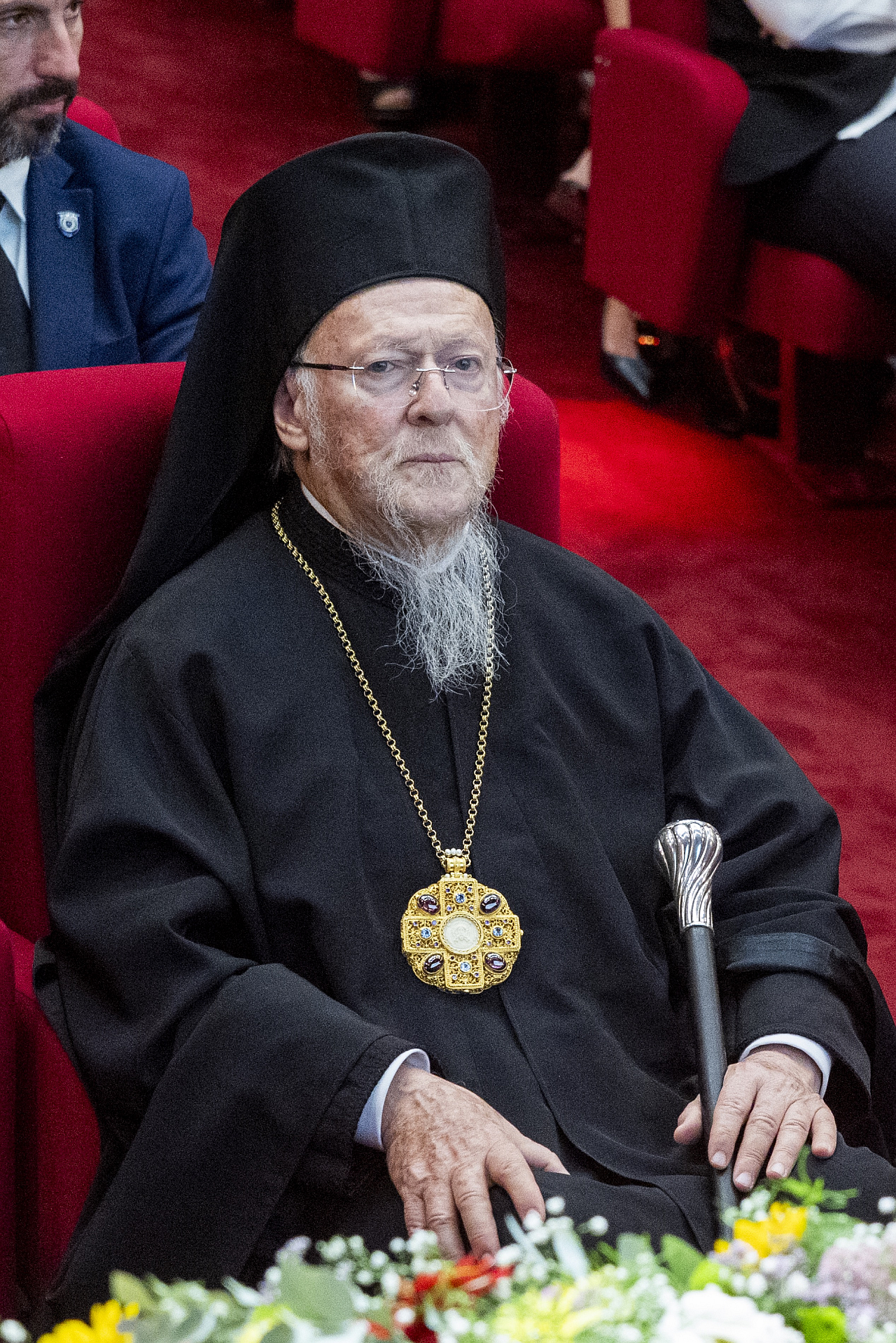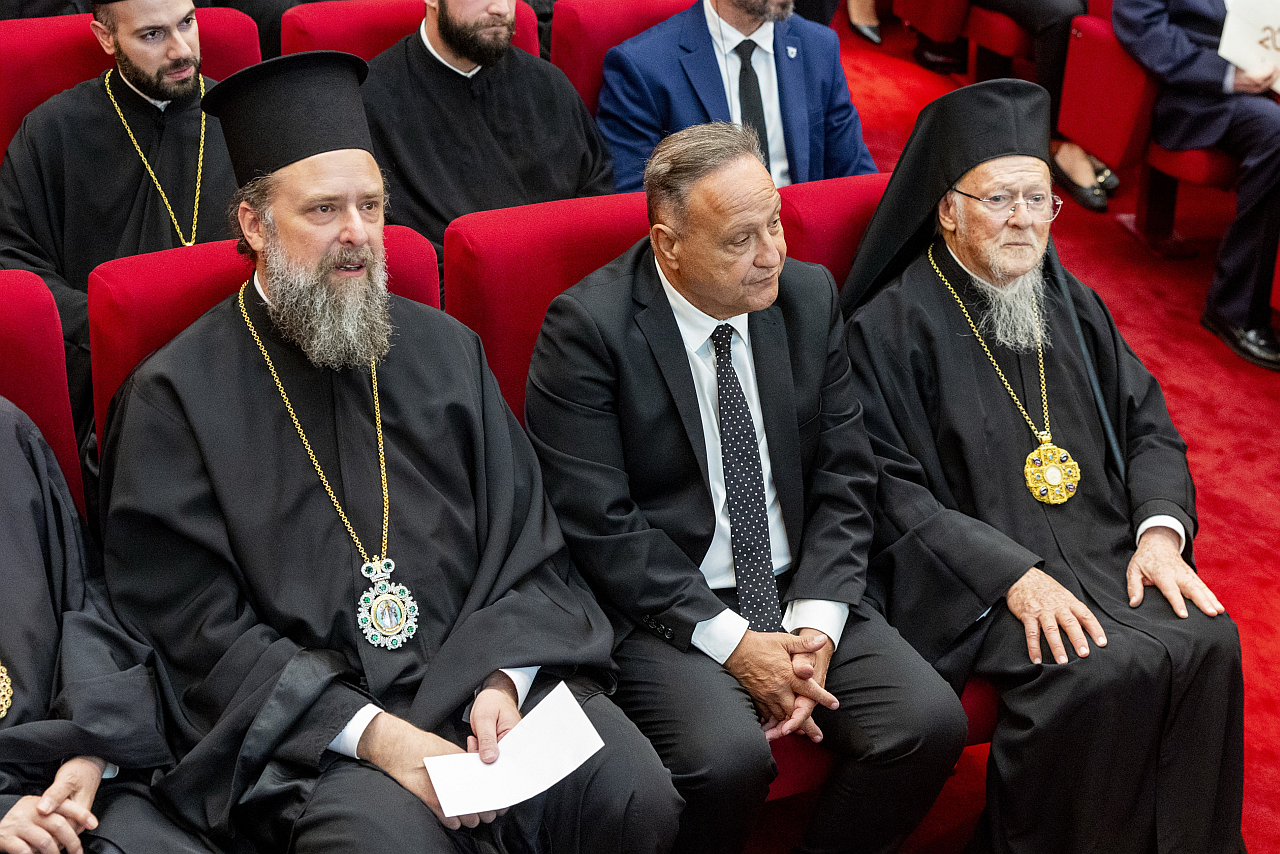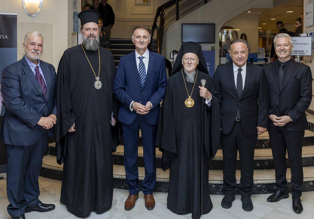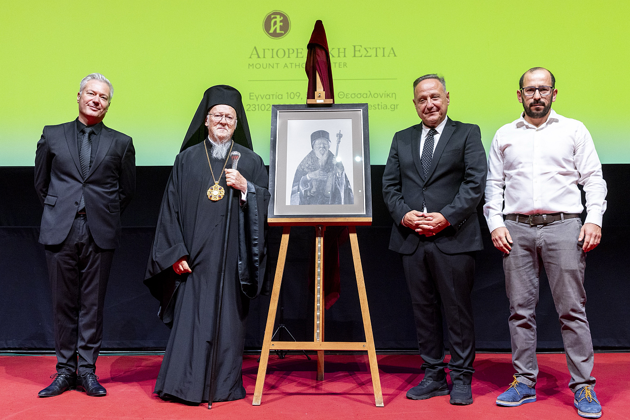 Ολοκληρώνοντας τον λόγο του ο Δήμαρχος Θεσσαλονίκης, κάλεσε τον Οικουμενικό Πατριάρχη να ανέβει στο βήμα και πριν ξεκινήσει την ομιλία του, του επίδωσε το δώρο της Αγιορειτικής Εστίας, ένα πορτραίτο του Οικουμενικού Πατριάρχη, έργο του εικαστικού Γιώργου Ταξίδη με τον οποίο ο φορέας συνεργάστηκε με την υλοποίηση εικαστικού προγράμματος και την διοργάνωση της έκθεσης «Άγιον Όρος. Τόπος σιωπής».